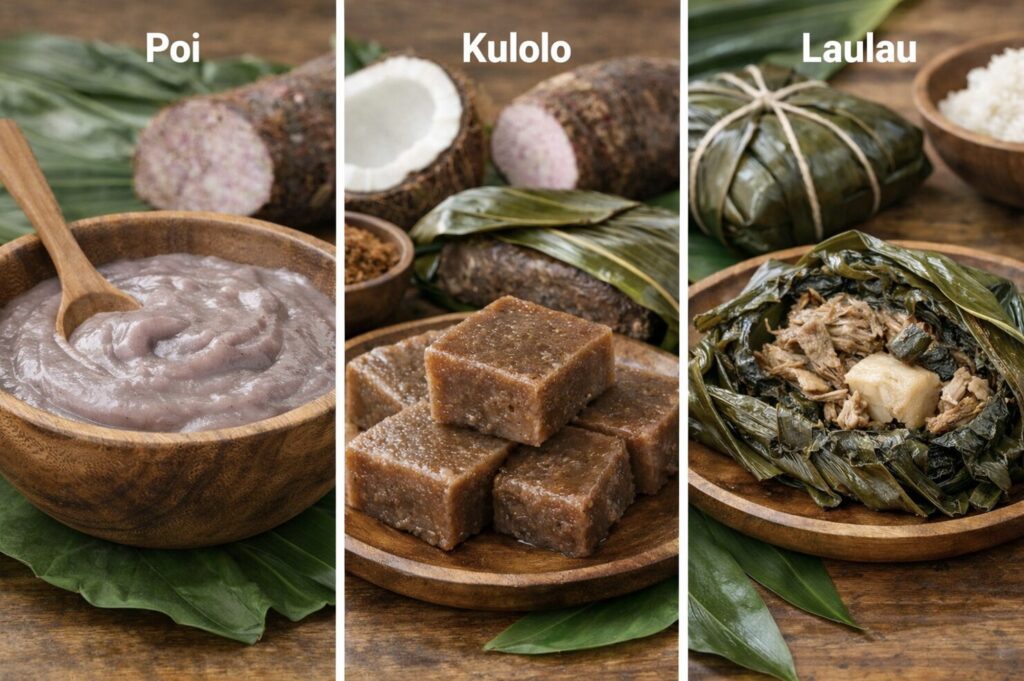 タロイモはハワイのみならずポリネシア地域においては非常に重要な主食で、すり潰して水を加えペースト状にし、発酵させたpoiポイは今でも伝統料理として食べられています。