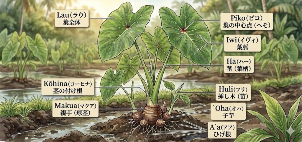 カロ(Kalo:タロイモ)の各部位の名称