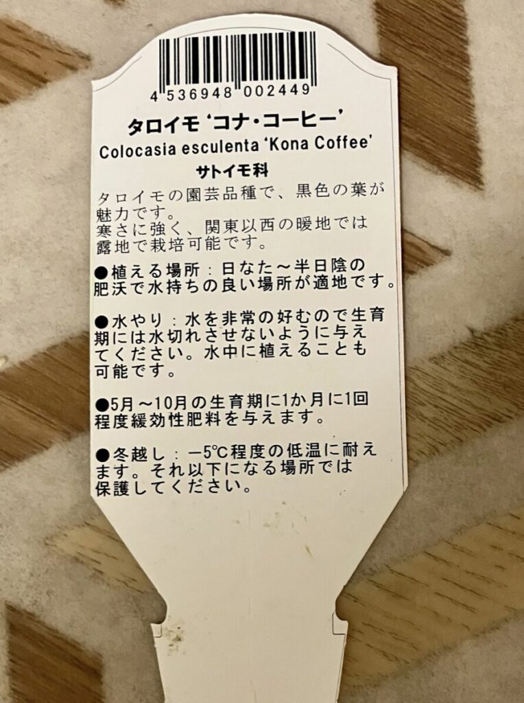 コナ・コーヒーと言う名のタロのタグ、耐寒性についての記載があります。