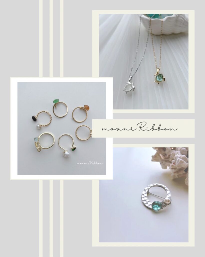moaniRibbonでは、自然と時間が生み出したシーグラスを主役に、シンプルで心地よいアクセサリーを制作しています。偶然が重なって生まれたかたちは、すべてが一点もの。海を愛する人の日常に、静かなときめきを届けます。